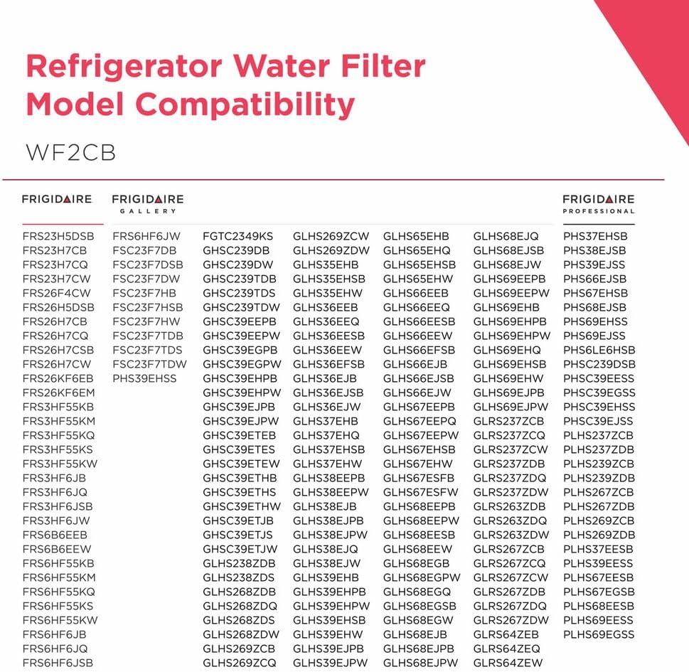 The Frigidaire WF2CB PureSource2 Replacement Filter helps maintain clean, great-tasting water and ice from your refrigerator. Specifically designed for Frigidaire side-by-side models manufactured after 2004, it effectively reduces chlorine flavor and odor, lead, mercury, and other common contaminants. Easy to replace and provides dependable filtration for up to 6 months or 200 gallons.